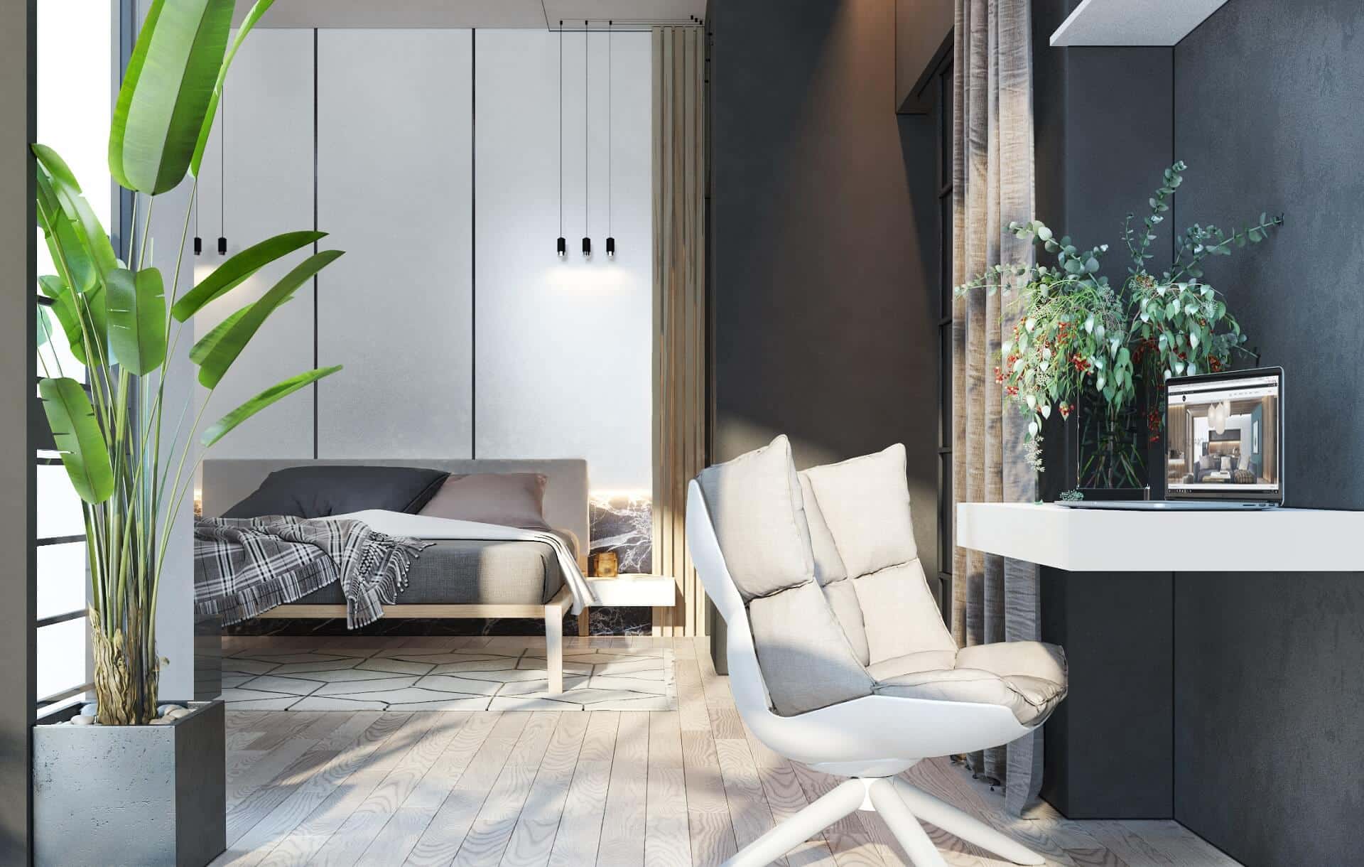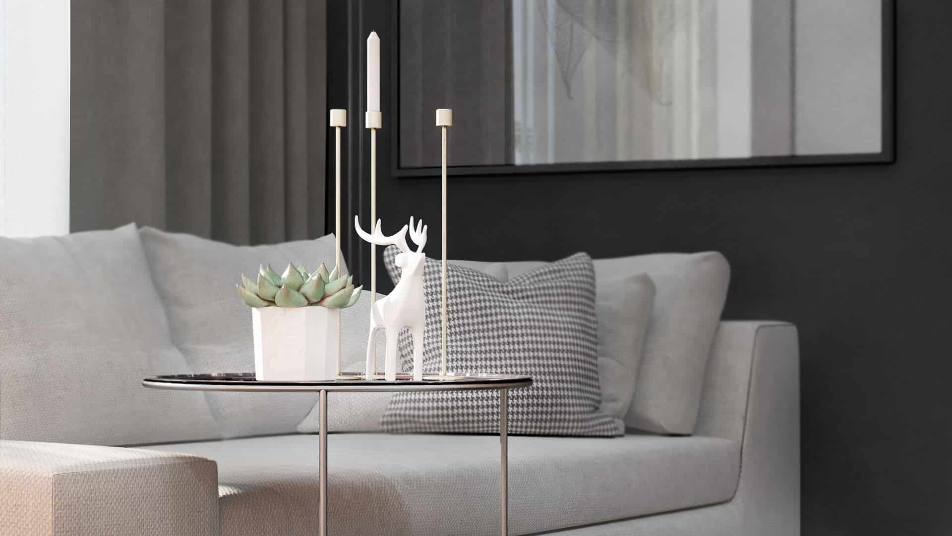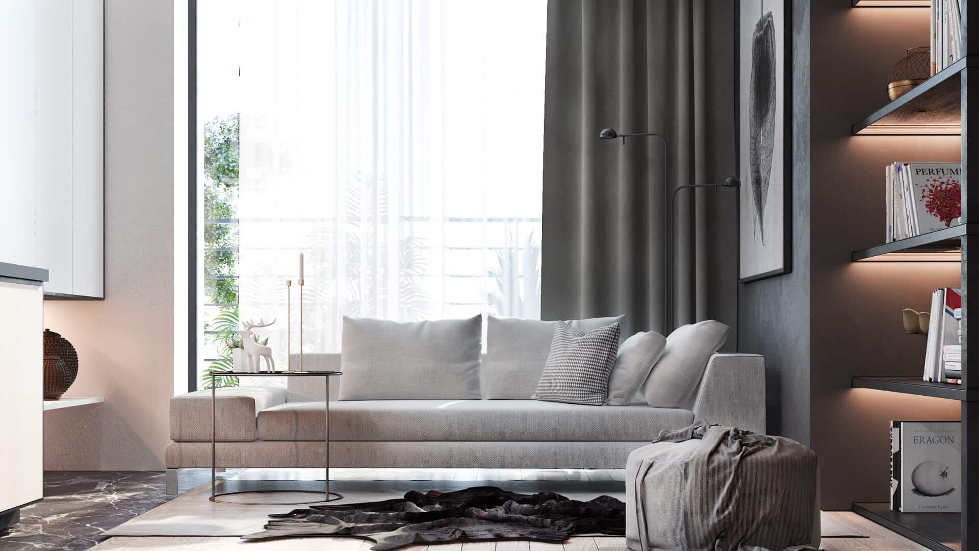 - Plush textiles, matte finishes, and touches of greenery give the apartment a homey feel.