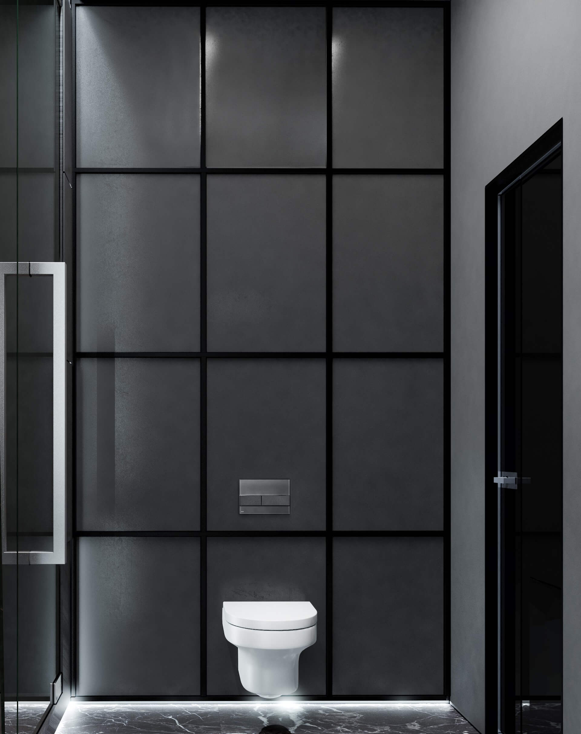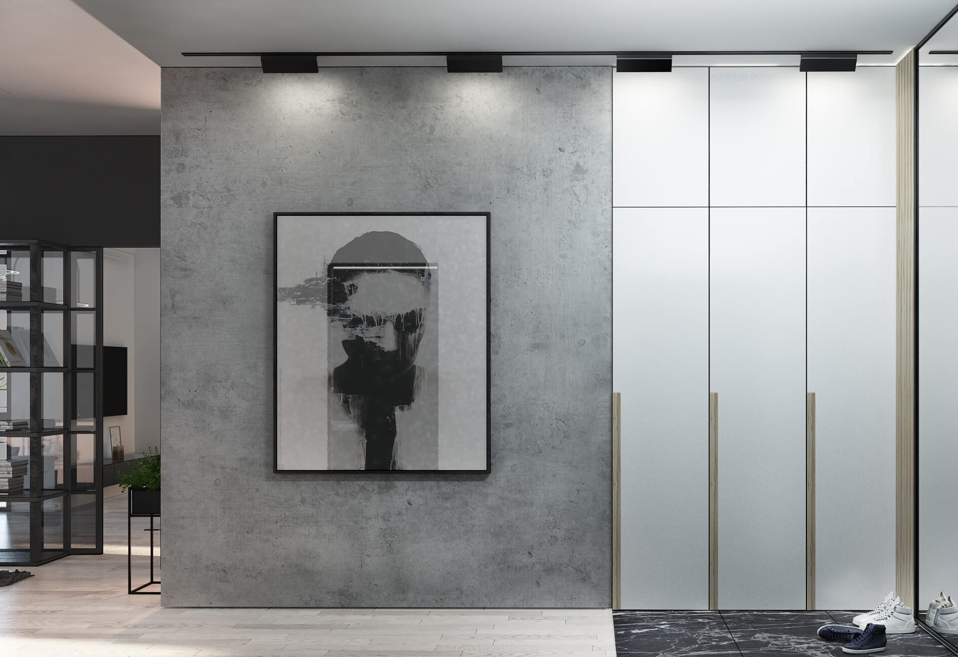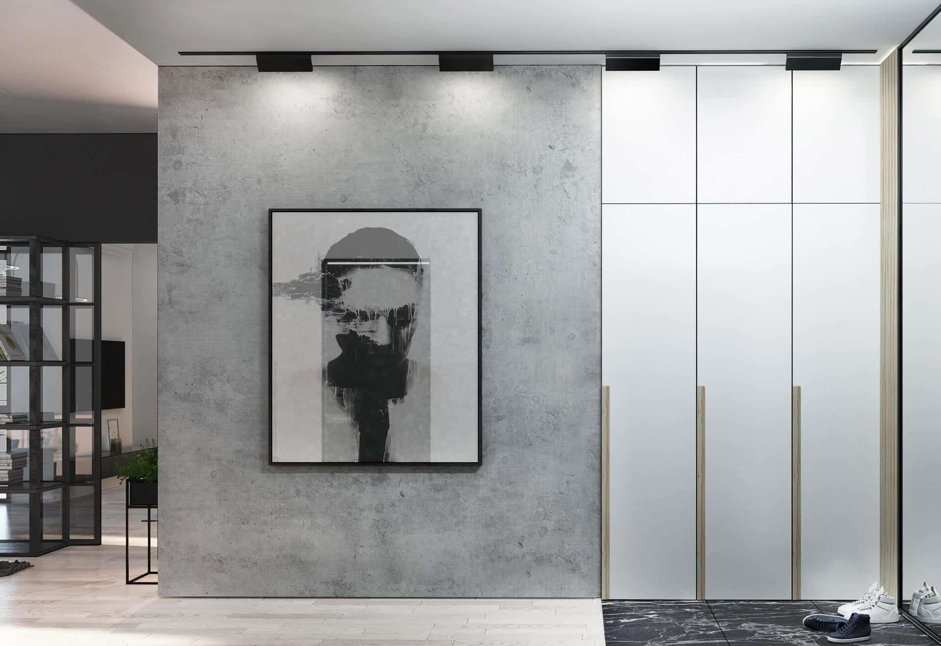 - Sleek metals and reflective surfaces complement the otherwise muted backdrop, subtly elevating modern elegance.