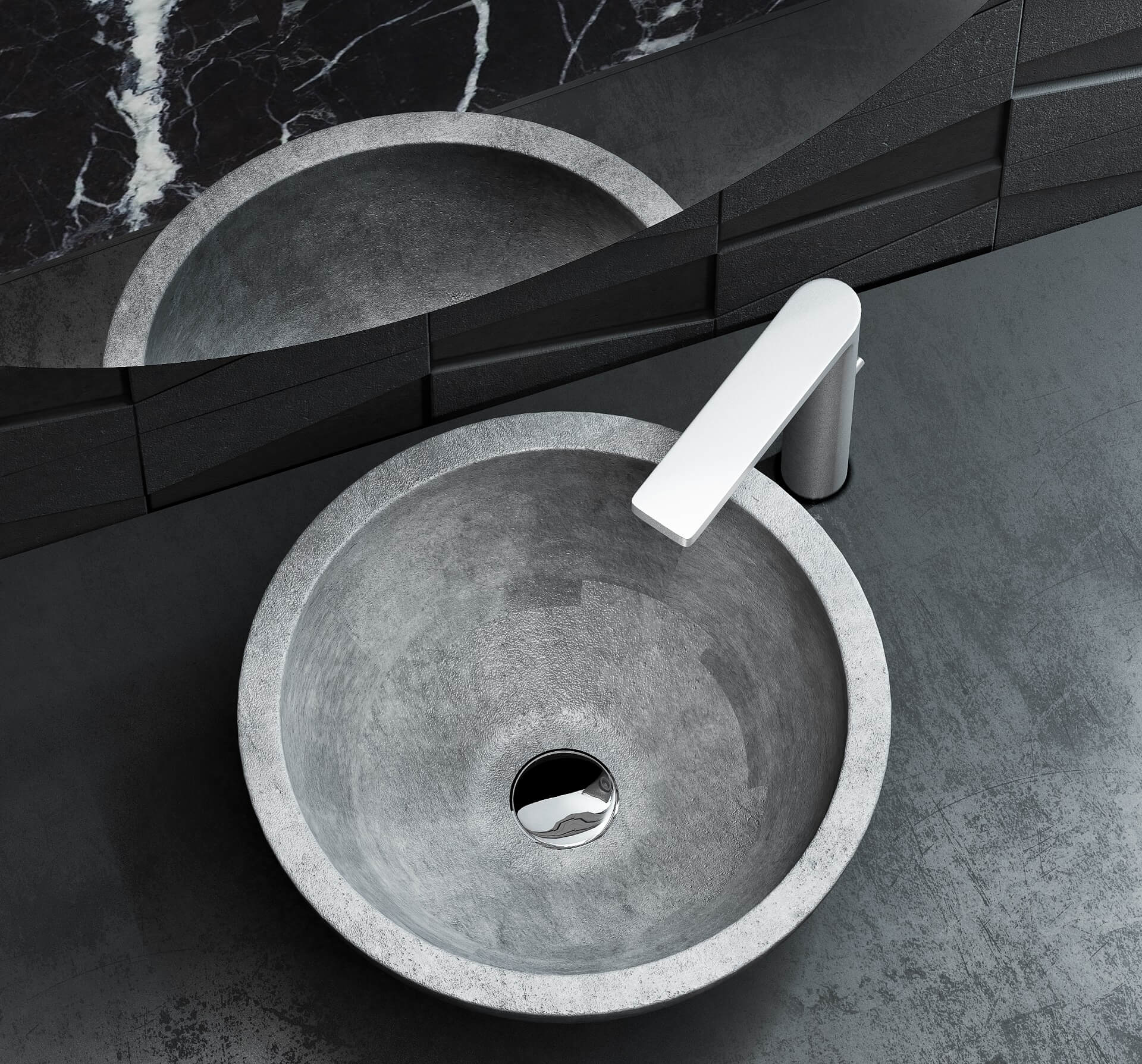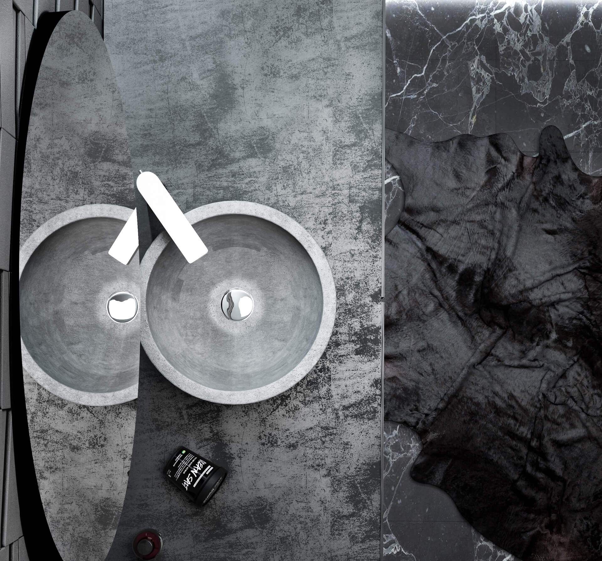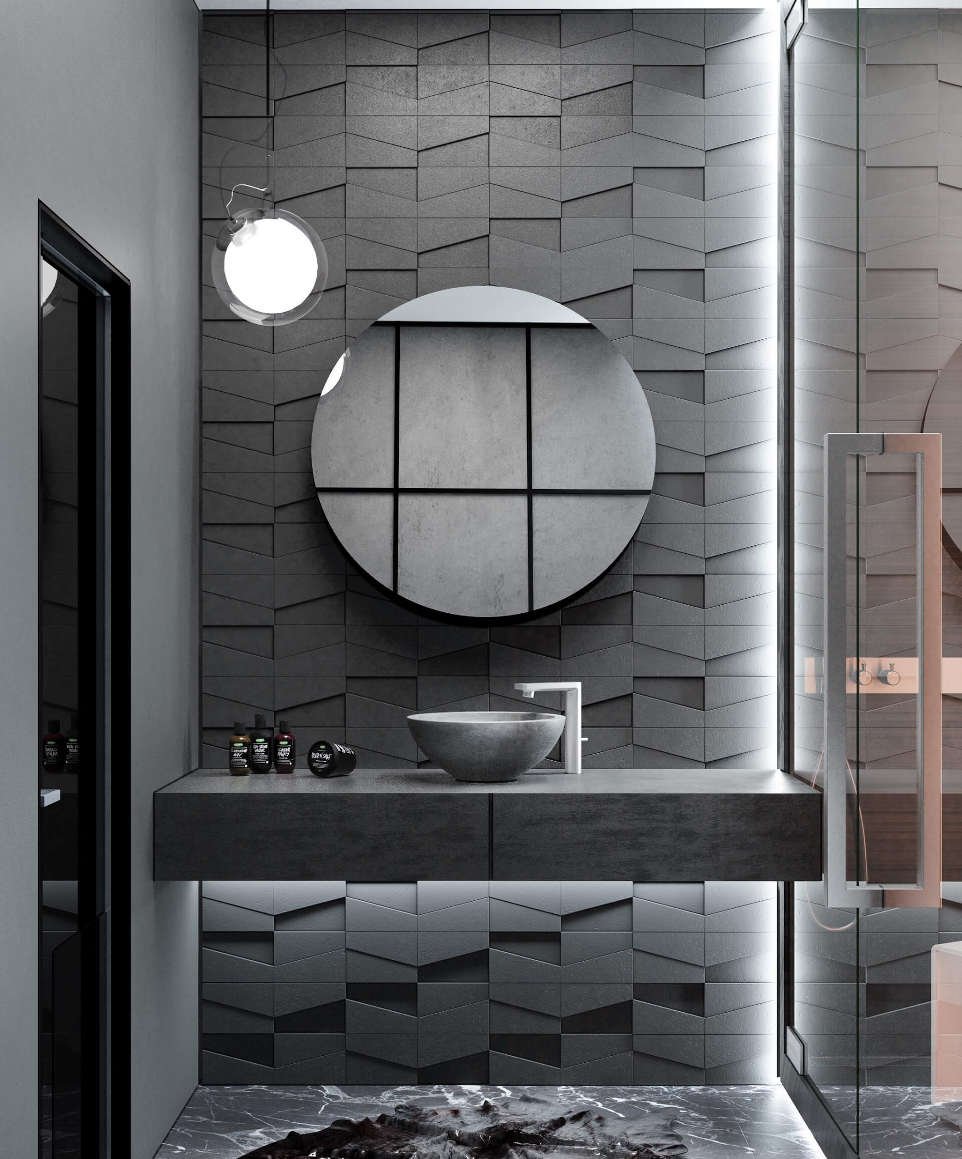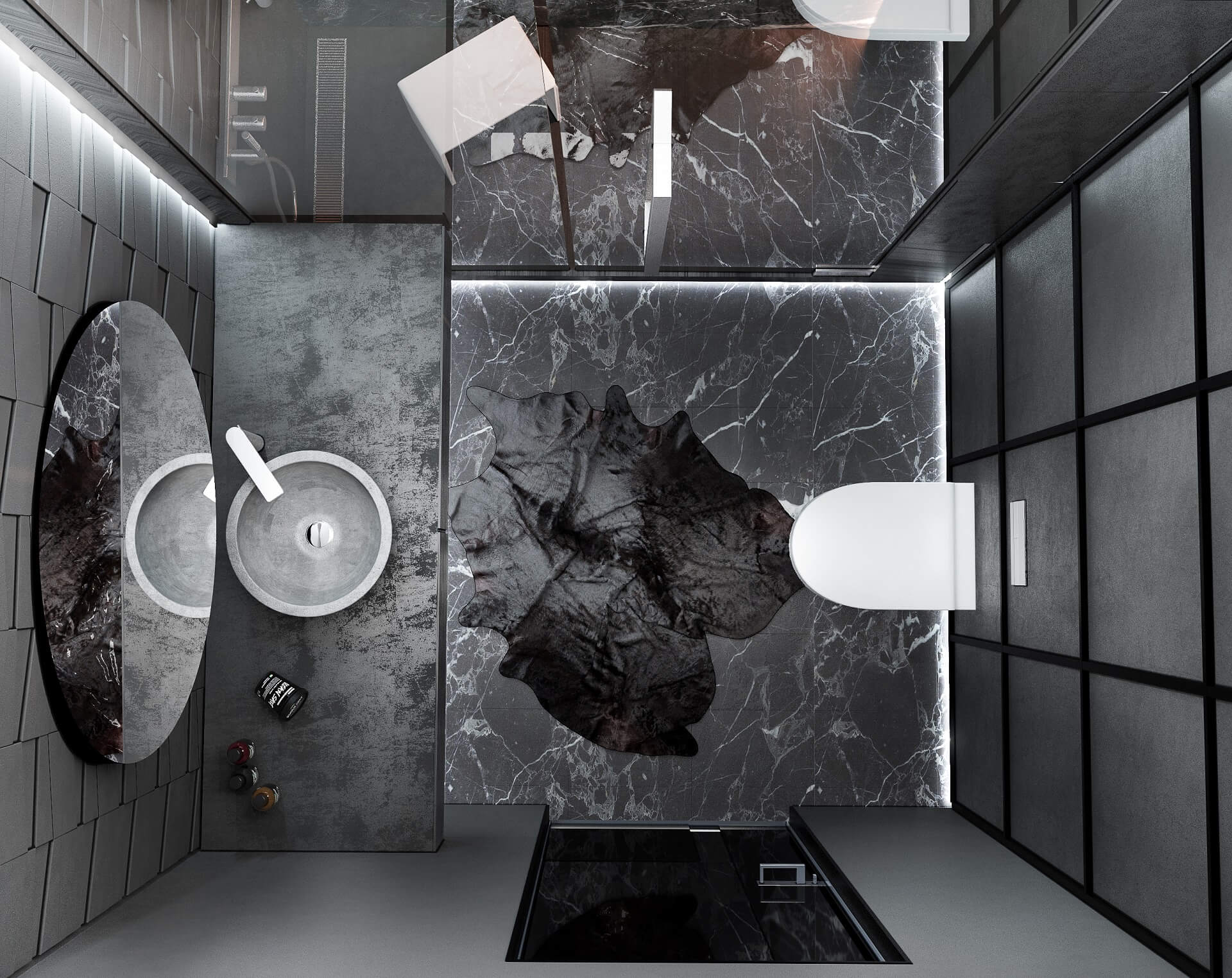 - Sleek metals and reflective surfaces complement the otherwise muted backdrop, subtly elevating modern elegance.