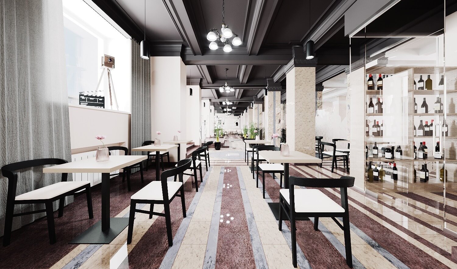 - A dramatic dark ceiling highlights the bright furnishings below, focusing attention on the café’s social spaces.
