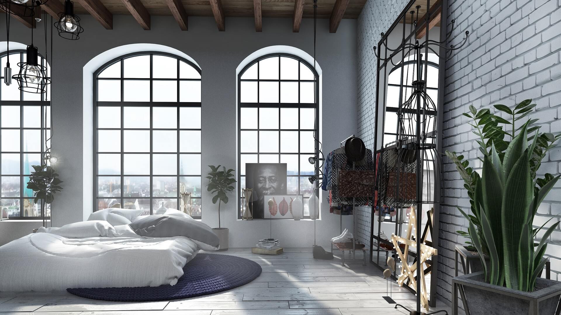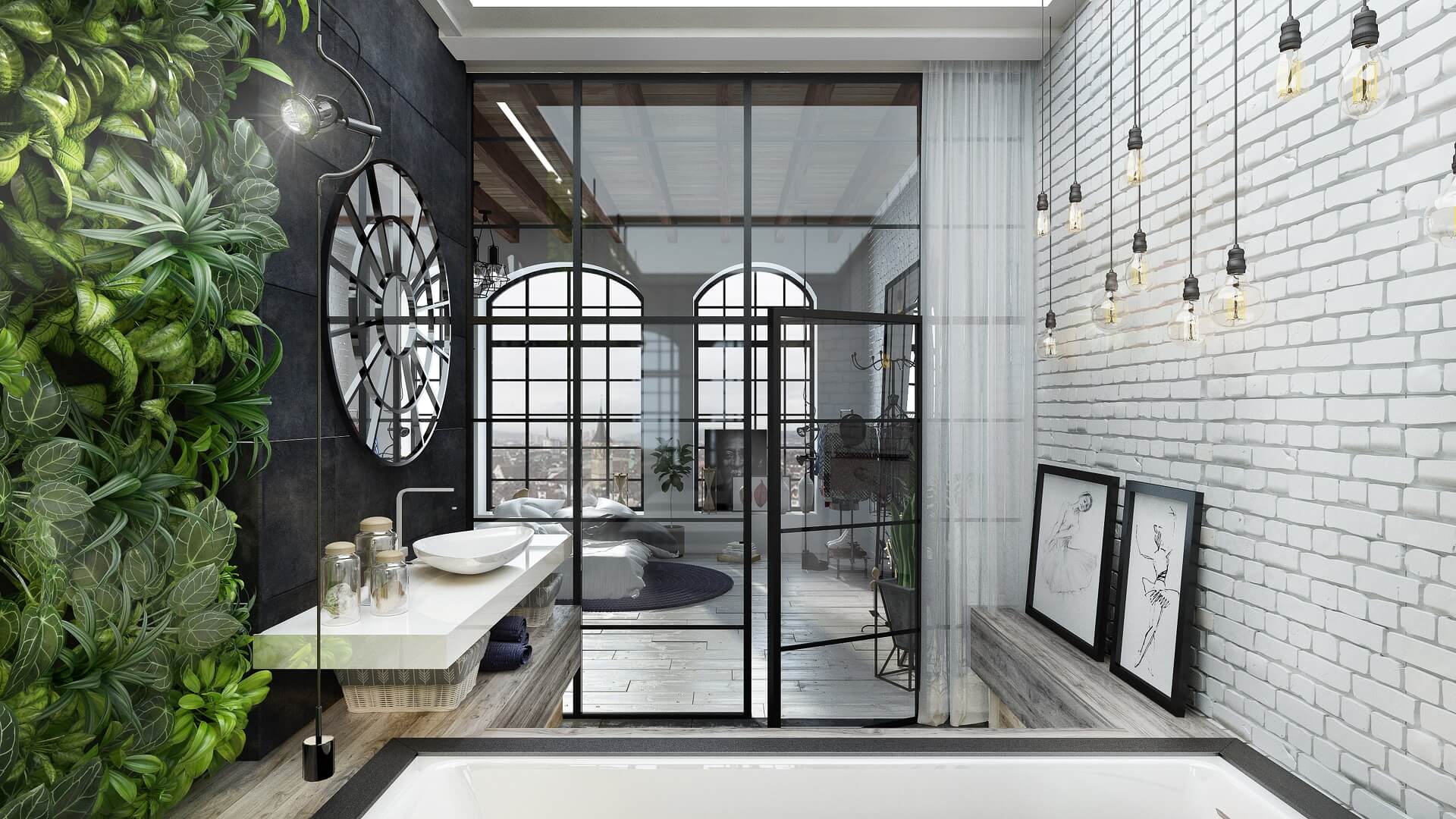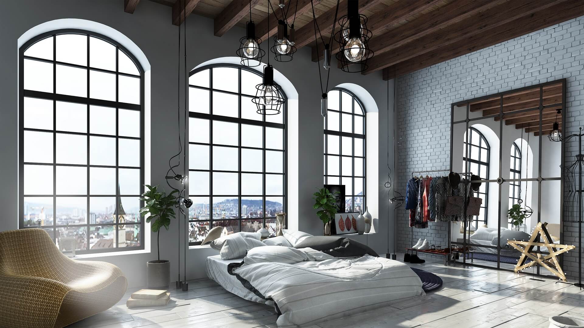 Immerse yourself in “Green Day Loft,” where industrial charm and lofty elegance come together to create a sunlit sanctuary overlooking the city skyline. Grand arched windows, exposed wooden beams, and light-reflecting surfaces set the stage for a sleek yet welcoming interior that embraces a modern, nature-inspired twist.