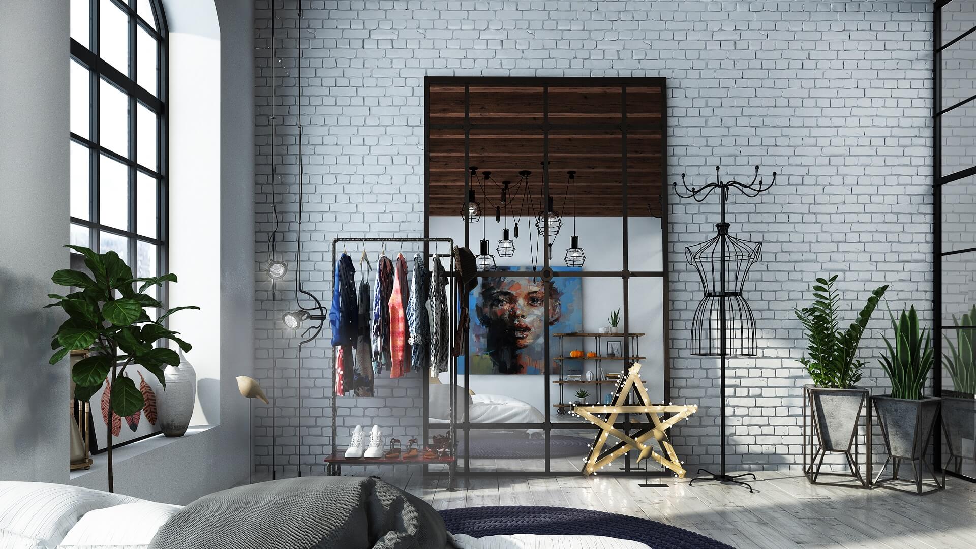 - An artfully arranged clothing rack and large framed mirror offer practical storage solutions while doubling as industrial-chic decor.