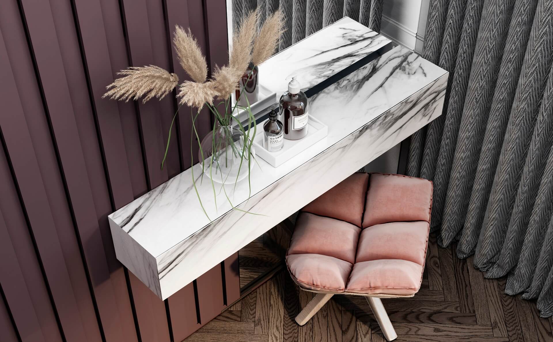 - Rich, maroon marble flooring sets the stage, exuding a sense of opulence and depth.