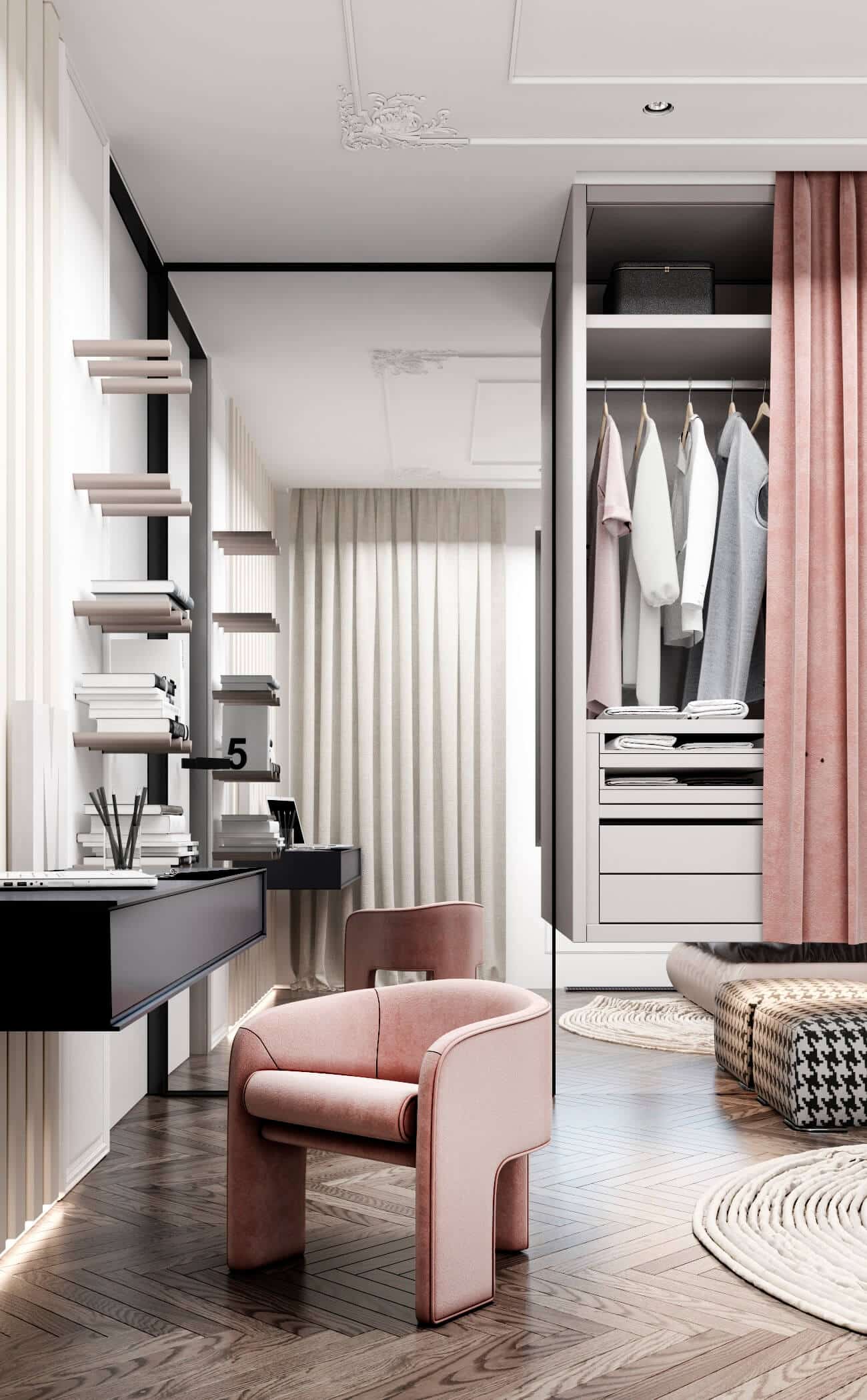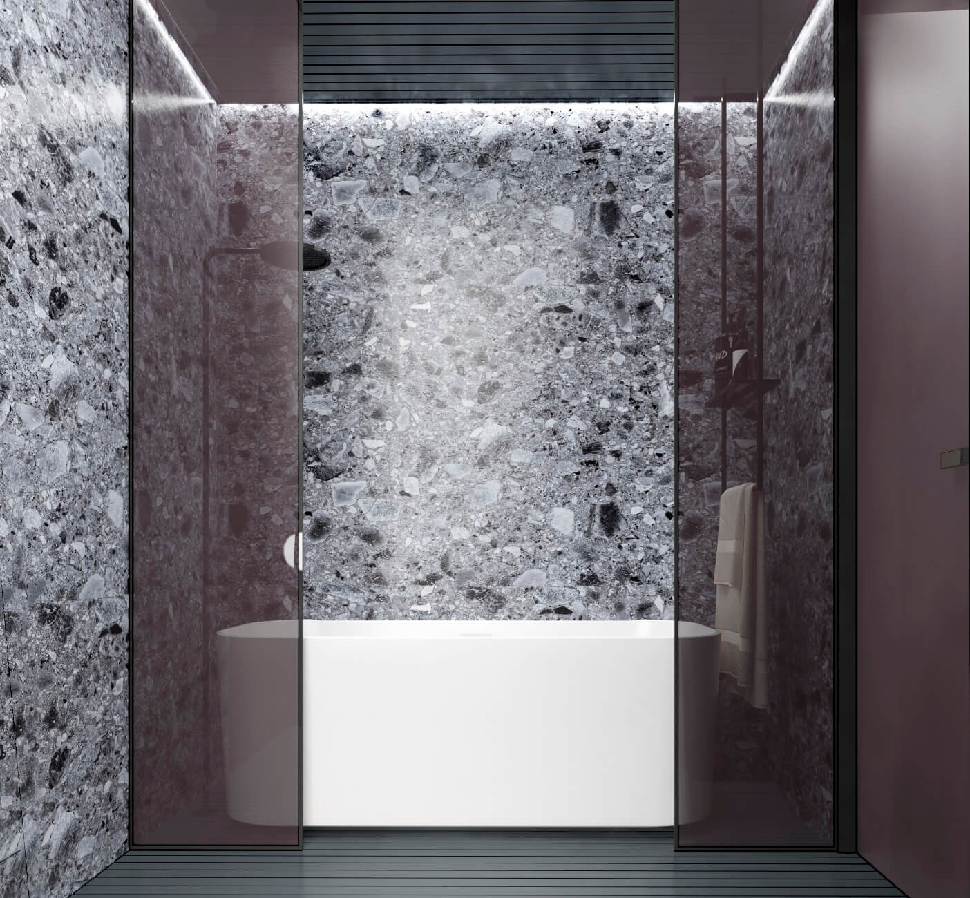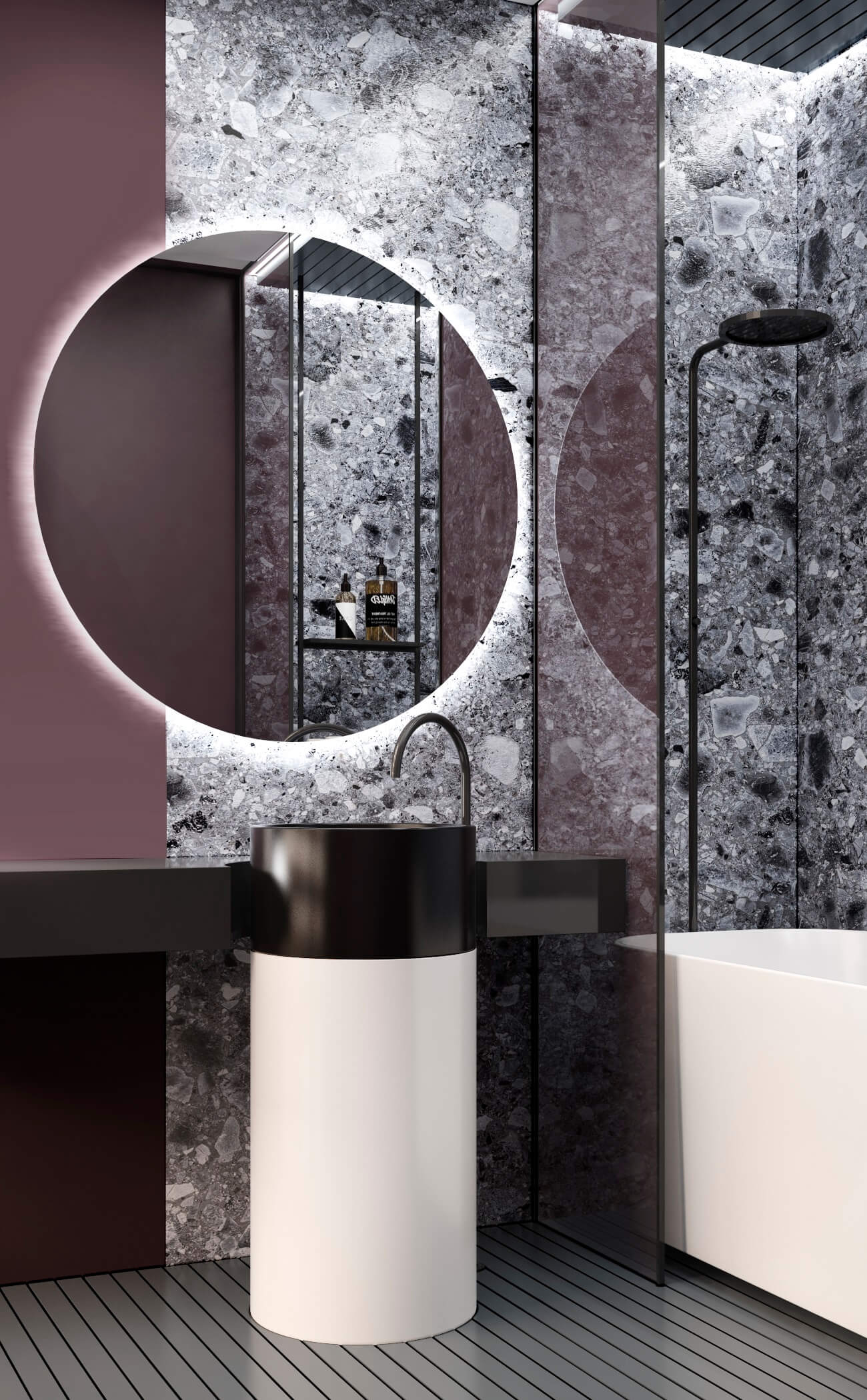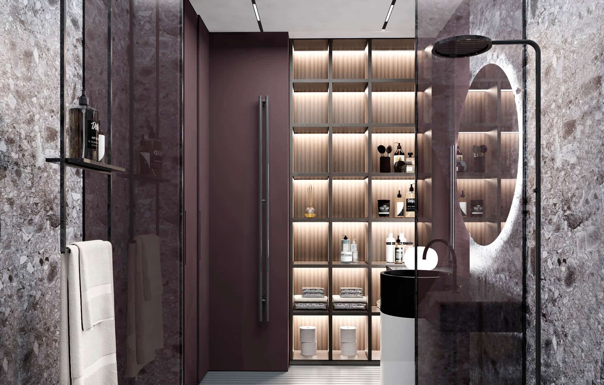 - Metal details—seen in the shelves and fixtures—inject a sleek, modern edge, complementing the overall luxurious atmosphere.