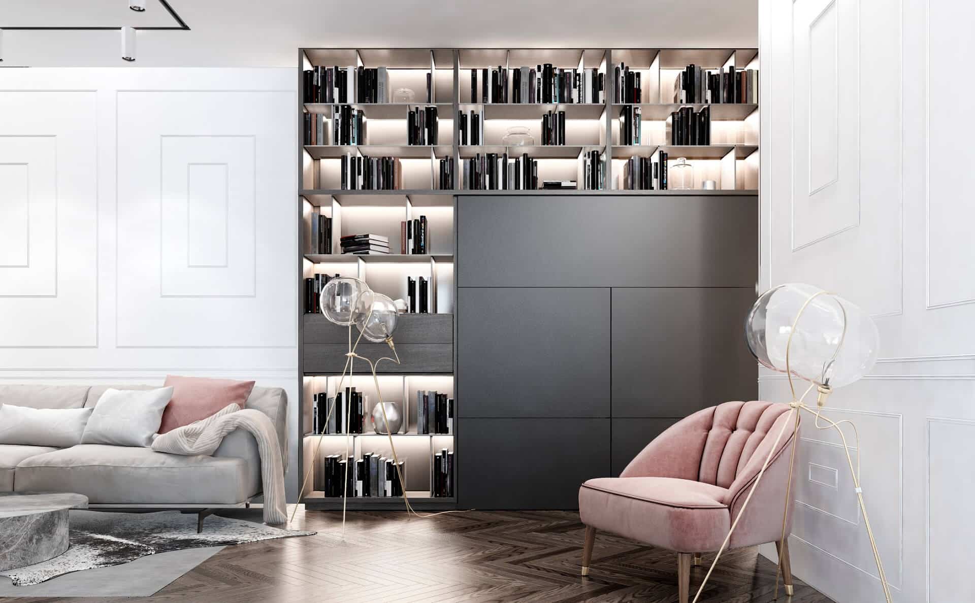 - Integrated shelving with soft backlighting provides both display and storage, maintaining a polished look.