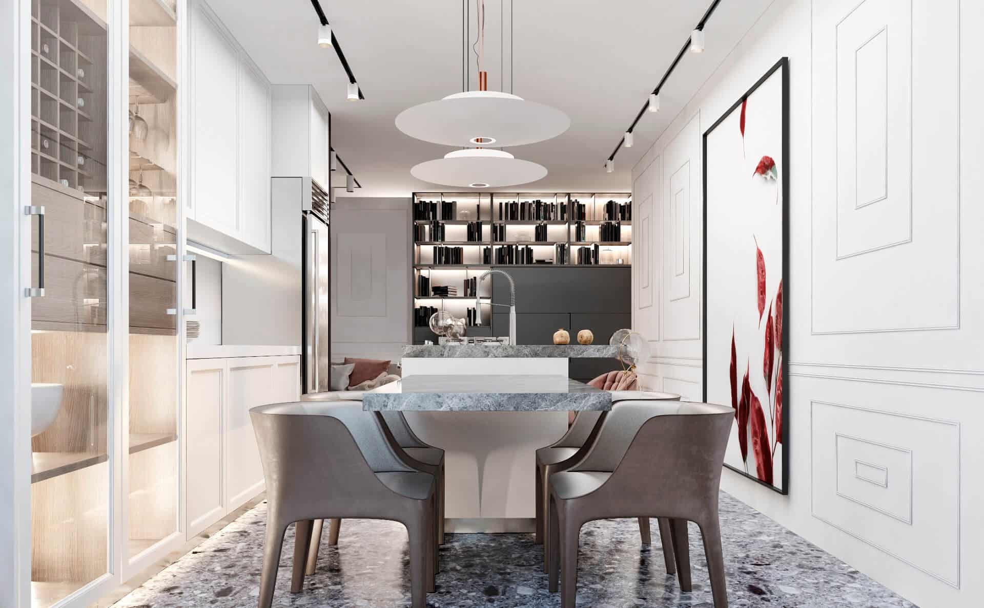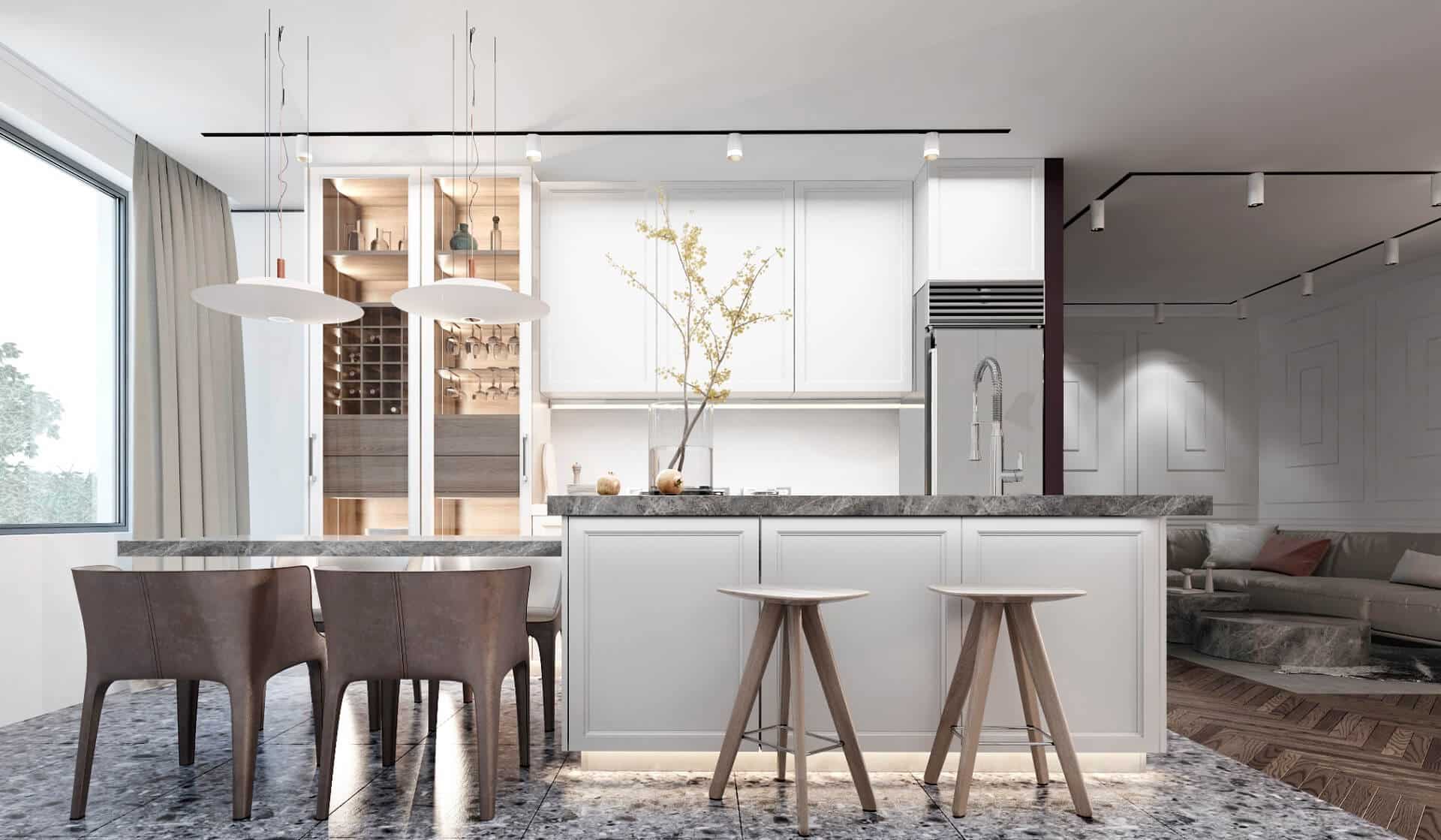 Embrace the “Maroon-Marble Mood,” a refined interior that pairs bold marble accents with alluring warm red hues to form a luxurious yet welcoming living space. This project plays with classic paneling, curated lighting, and sleek modern fixtures, creating a contemporary dining and social area ideal for both intimate gatherings and grand entertaining. At the heart of this design is a statement marble island, surrounded by crisp cabinetry and stylish seating—striking a beautiful balance between elegance and practicality.