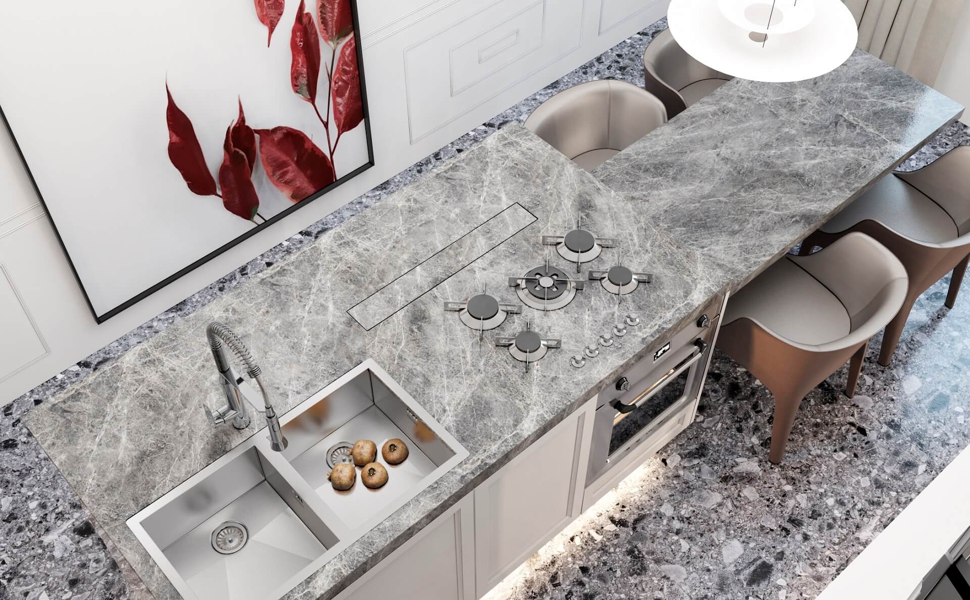 - A multi-tiered marble island doubles as a gathering point, showcasing the interplay between form and function.