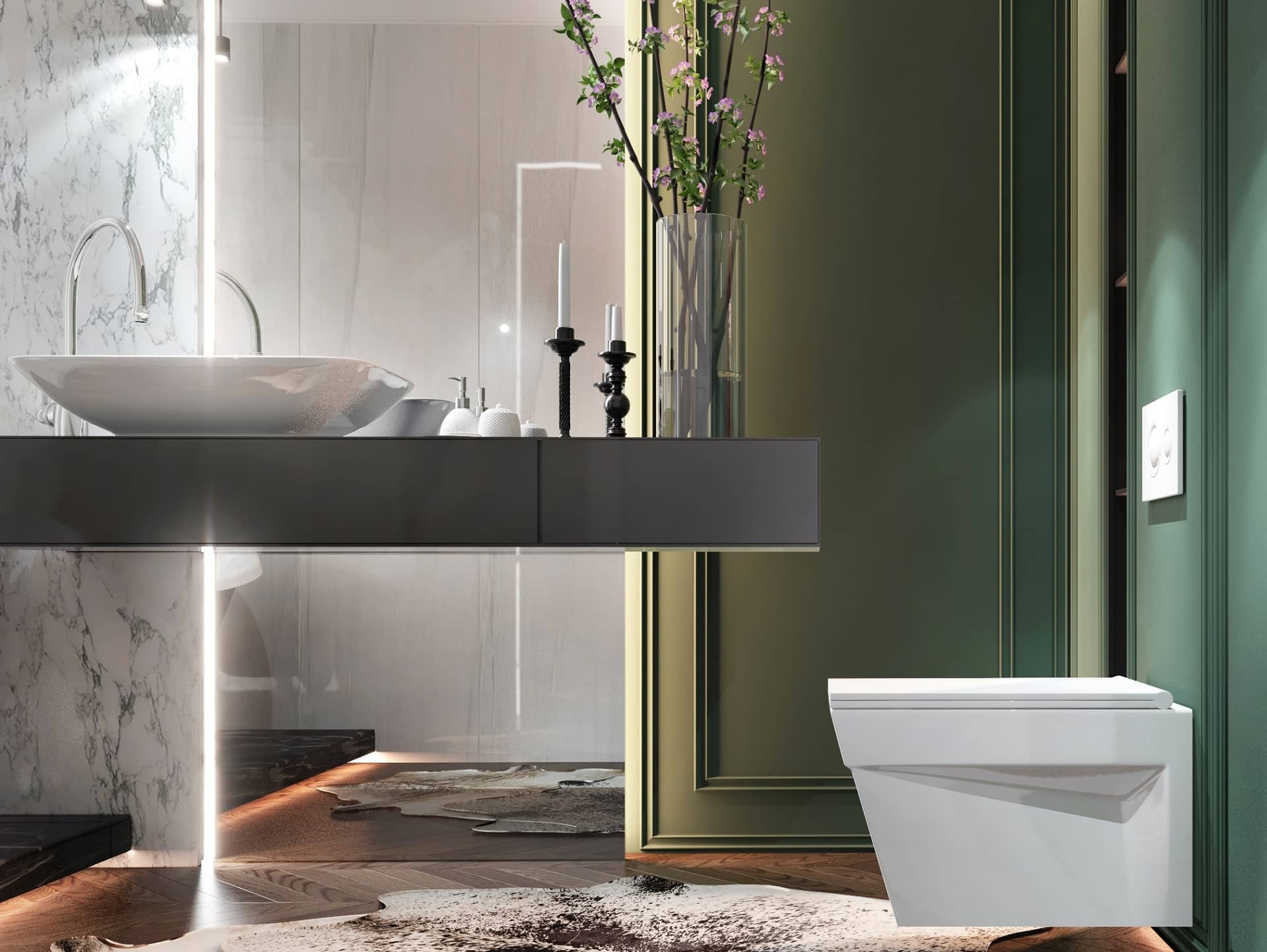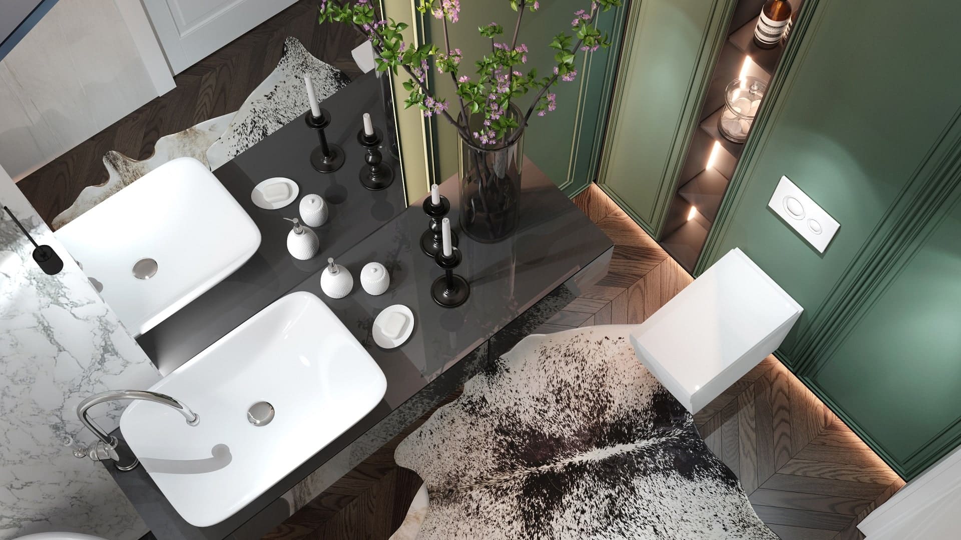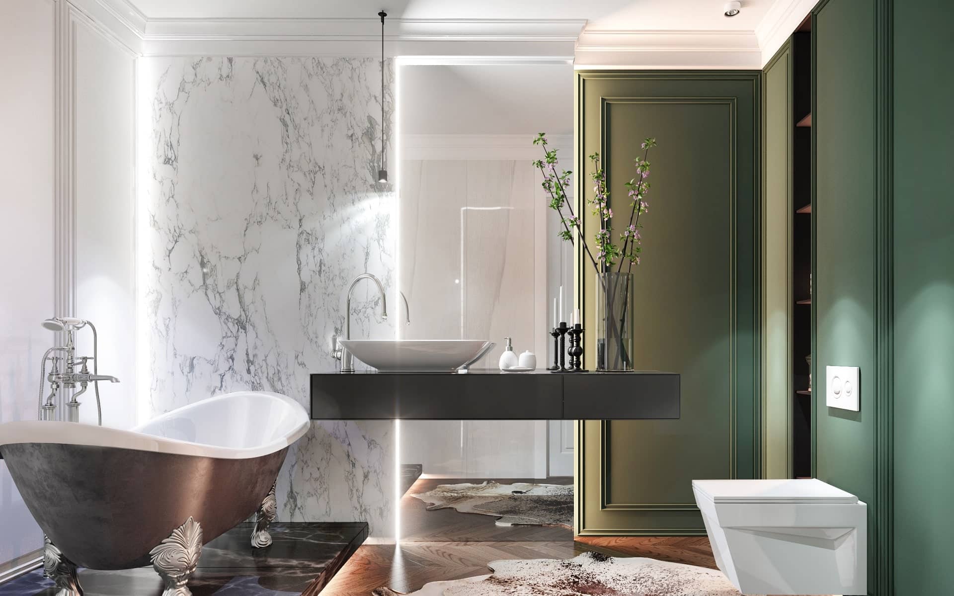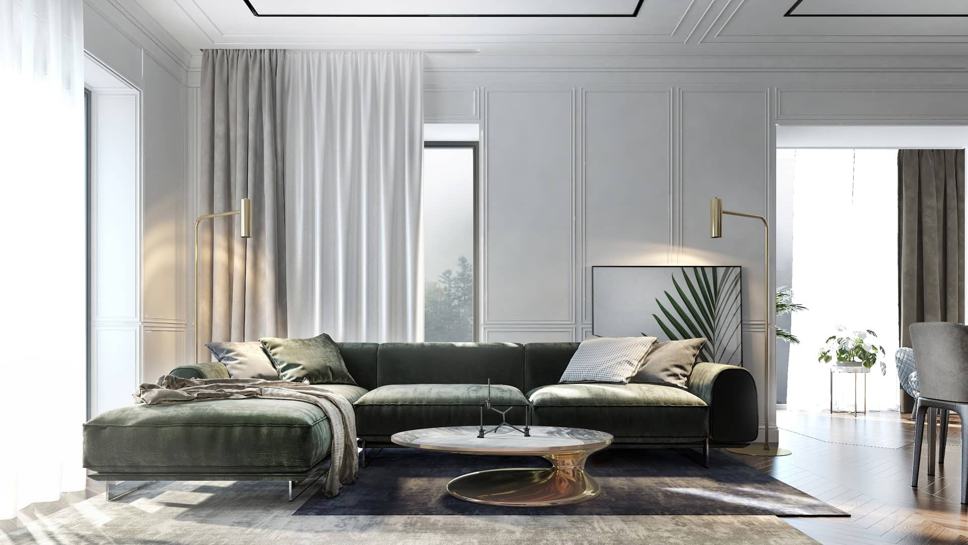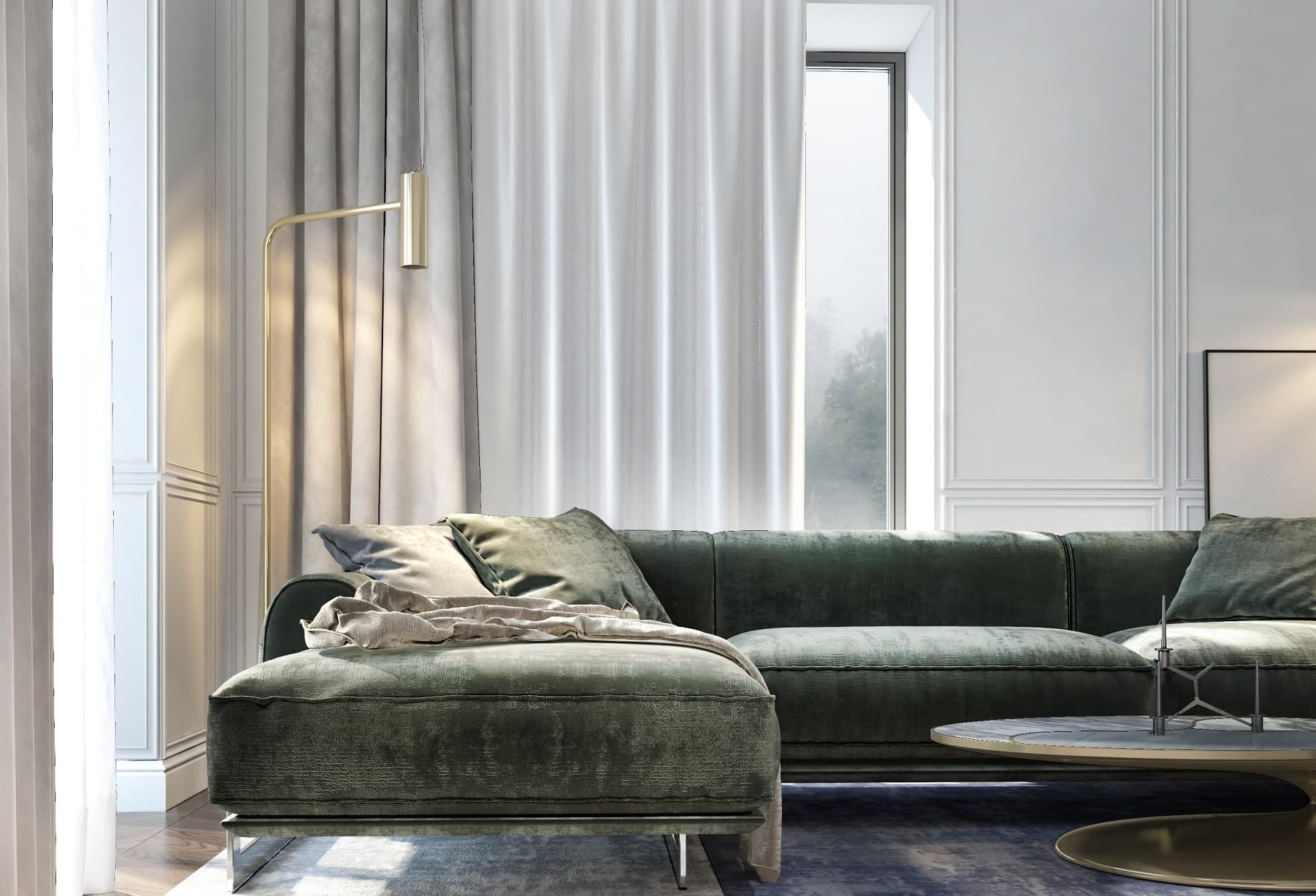 - An inviting green velvet sofa serves as a bold focal point, counterbalancing the surrounding neutrals with a rich, organic warmth.