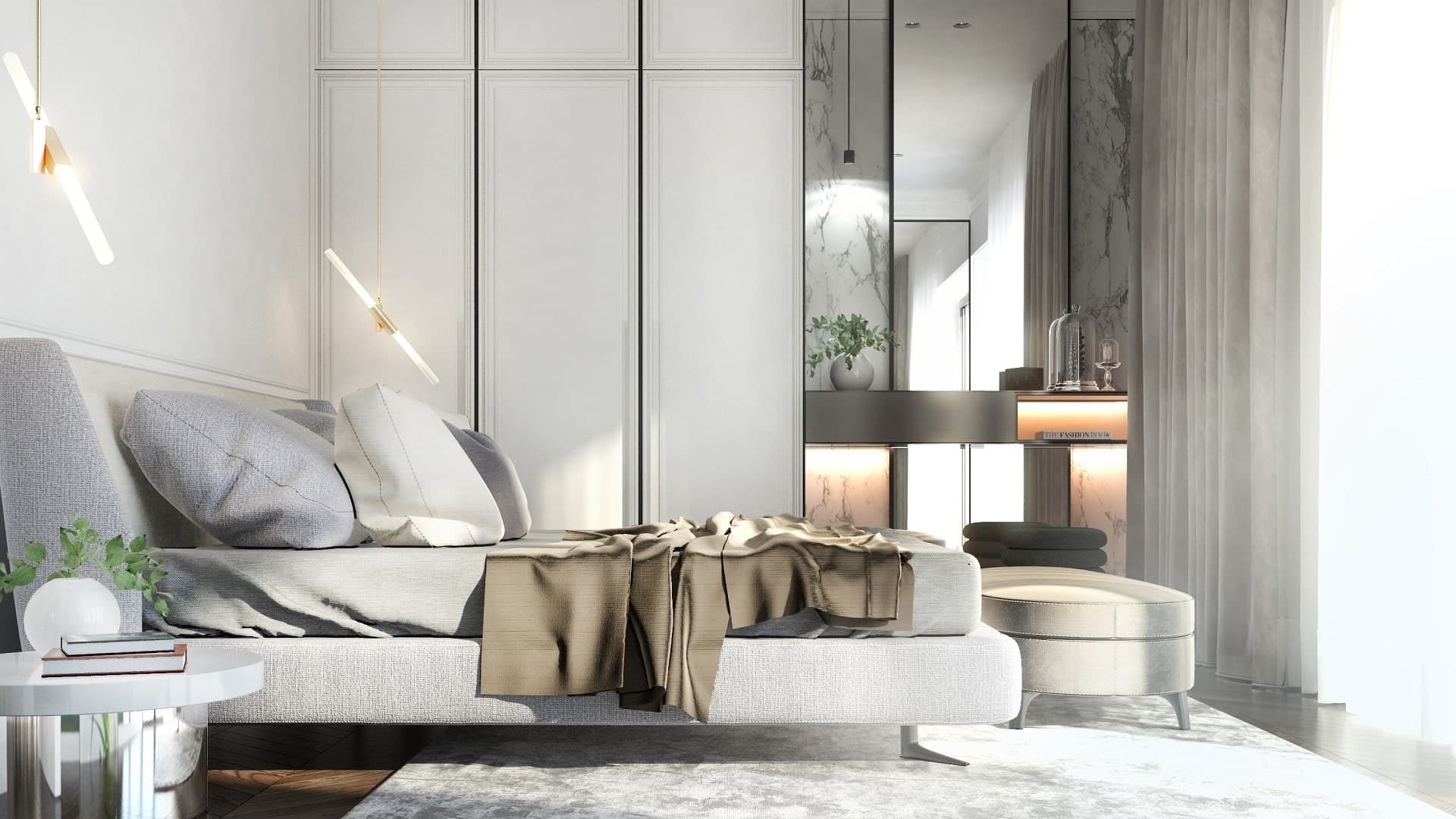 - Layered shades of gray, ivory, and taupe introduce subtle variety, reinforcing the space’s soft, tranquil vibe.